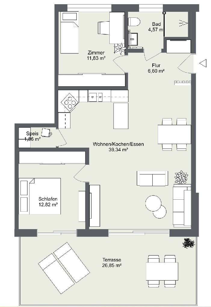 Im Zentrum der Wohnung steht der großzügige Wohn- und Essbereich mit offener Küche (ca. 39 m²). Dank der Südausrichtung und der großen Fensterflächen ist der Raum besonders lichtdurchflutet und einladend. Von hier aus gelangt man direkt auf die sonnige Terrasse – ideal, um entspannte Stunden im Freien zu genießen. Das Schlafzimmer (ca. 14 m²) bietet ebenfalls Terrassenzugang und einen ruhigen Rückzugsort. Ein weiteres Zimmer (ca. 12 m²) lässt sich flexibel als Kinder-, Arbeits- oder Gästezimmer nutzen.