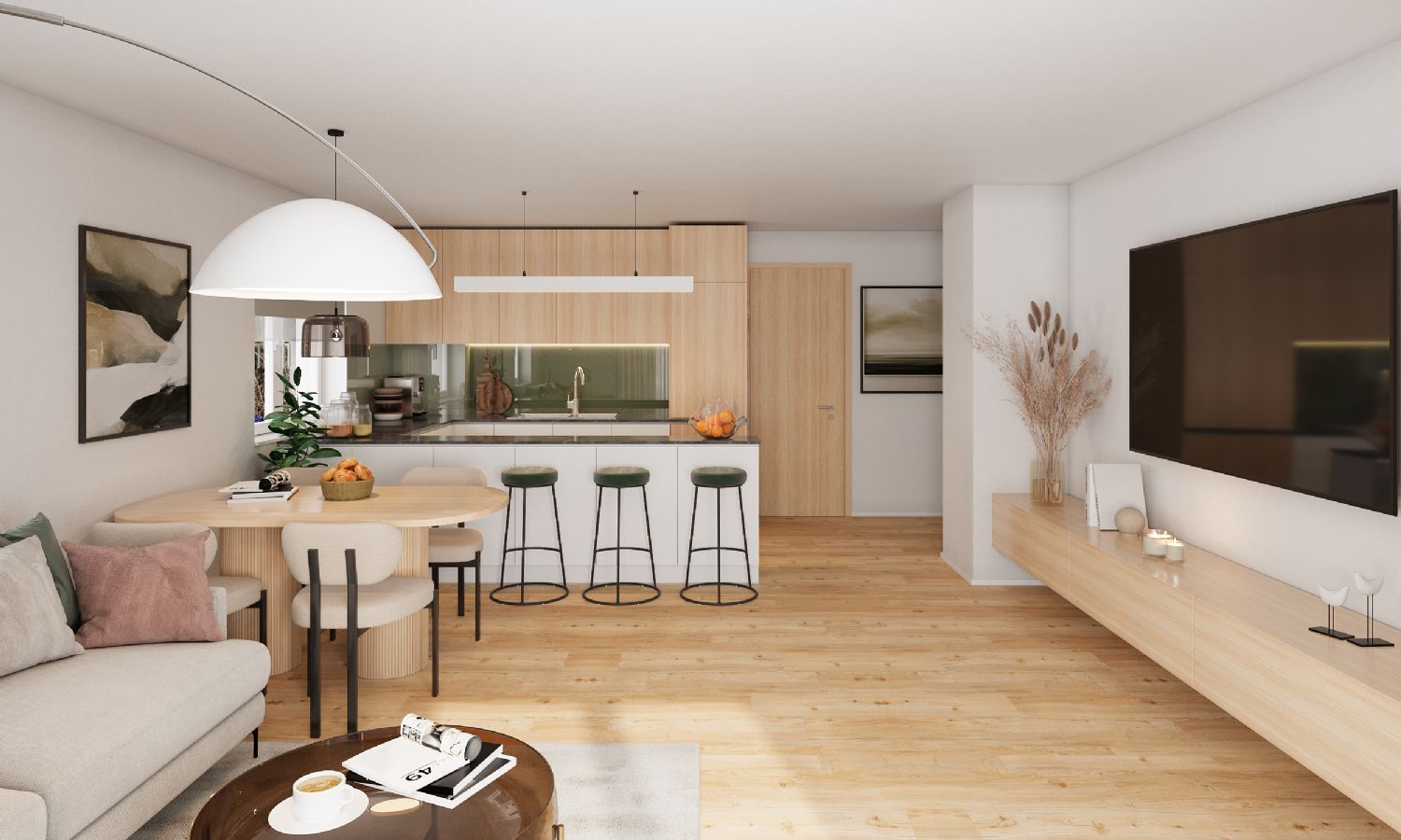 Der Wohn- und Essbereich mit offener Küche (ca. 34 m²) bildet das Herzstück der Wohnung. Dank der Südausrichtung und der großen Fensterflächen präsentiert sich der Raum freundlich und lichtdurchflutet. Das Schlafzimmer (ca. 18 m²) und das zusätzliche Zimmer (ca. 14 m²) bieten Raum für individuelle Wohnideen. Modern und einladend präsentiert sich das Tageslichtbad mit bodengleicher Dusche, Glasduschkabine, elektrischem Handtuchheizkörper und großformatigen Fliesen.